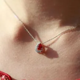 The 0.55 Carat Pear-Cut Ruby Diamond Necklace embodies timeless beauty and refined craftsmanship.