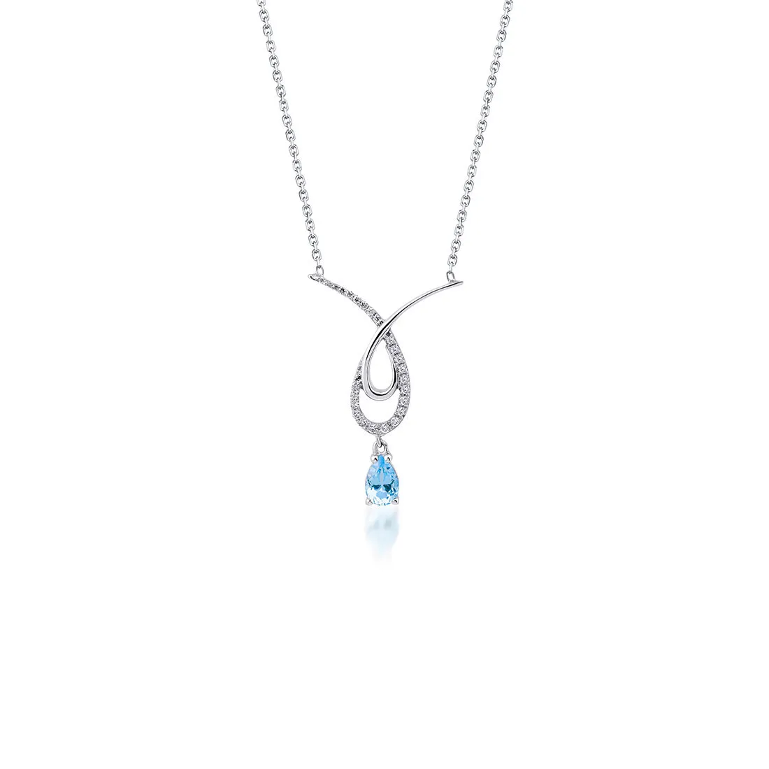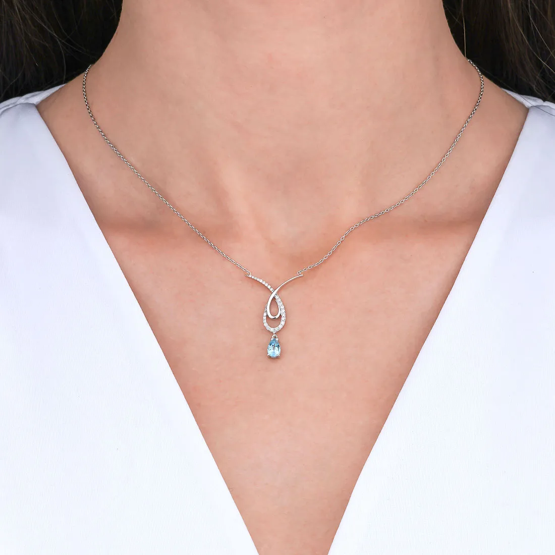 The Diamond Blue Topaz Necklace captures the essence of refined beauty through perfect harmony between diamonds and gemstone color. At its heart lies a stunning 0.42-carat blue topaz, shimmering with the calm hues of the ocean. Surrounding it are twenty-five round brilliant diamonds, totaling 0.15 carats, graded H in color and VS/SI in clarity. Together, they create a radiant balance of light and color that defines true sophistication.