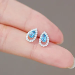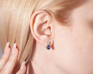 $600 – $655Price range: $600 through $6550 out of 5The Pear-Shaped Sapphire Earrings with Diamond Halo in Gold offer a graceful blend of color, brilliance, and refined elegance.