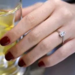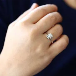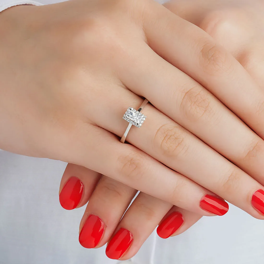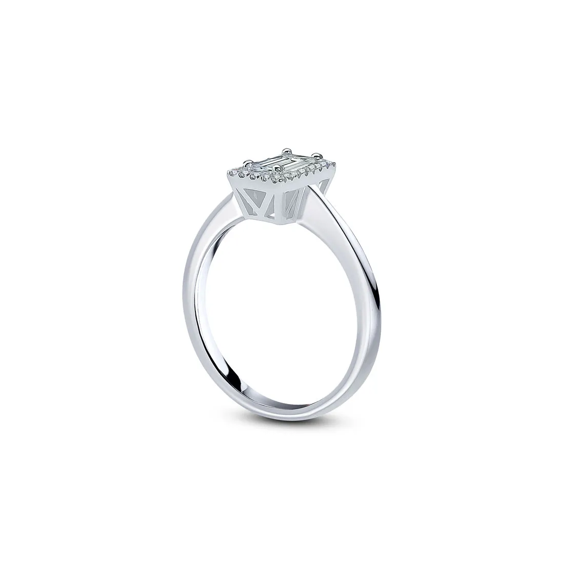 The 0.35 Carat Baguette Diamond Solitaire Ring is designed to capture elegance in its purest form. At the heart of the design rests a 0.25 carat baguette-cut diamond, graded G in color and SI in clarity. This diamond is known for its clean lines and refined sparkle, creating a sophisticated focal point. Surrounding the center stone are sixteen round brilliant diamonds, totaling 0.10 carats, with G color and VS to SI clarity, adding radiance and brilliance.
