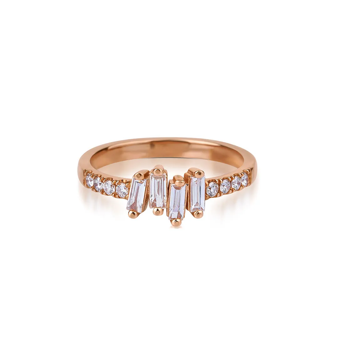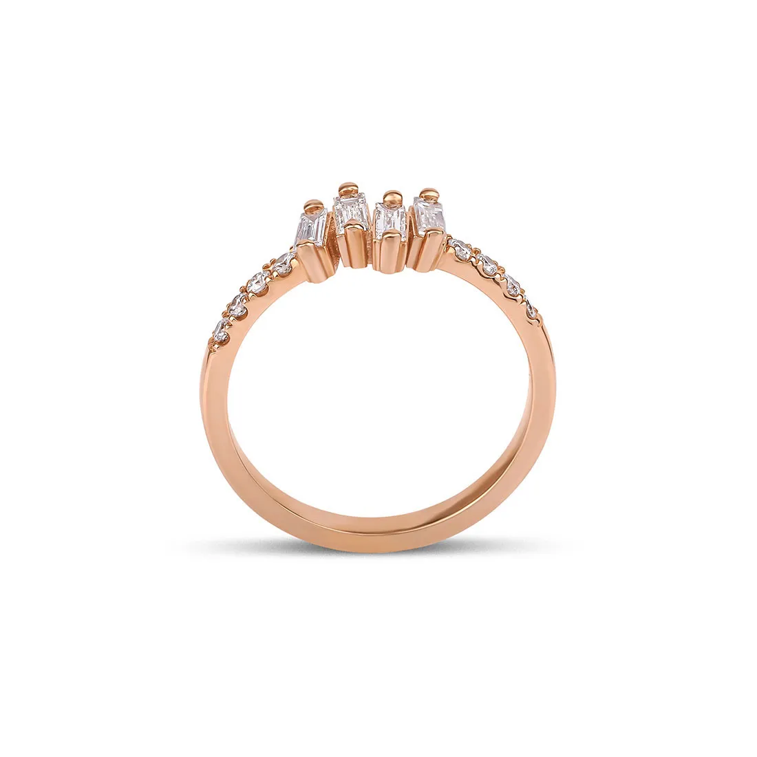 The 0.38 Carat Quattro Baguette Diamond Rose Gold Designer Ring is crafted to reflect timeless elegance with a modern twist. This exceptional design features four baguette-cut diamonds weighing 0.30 carats in total, paired with eight round brilliant diamonds weighing 0.08 carats. Each diamond is F color and VS clarity, ensuring brightness and sparkle from every angle. Combined, they create a refined harmony of linear precision and radiant brilliance.
