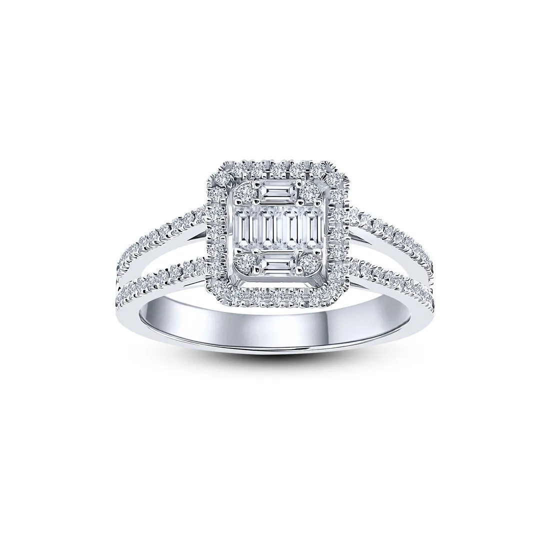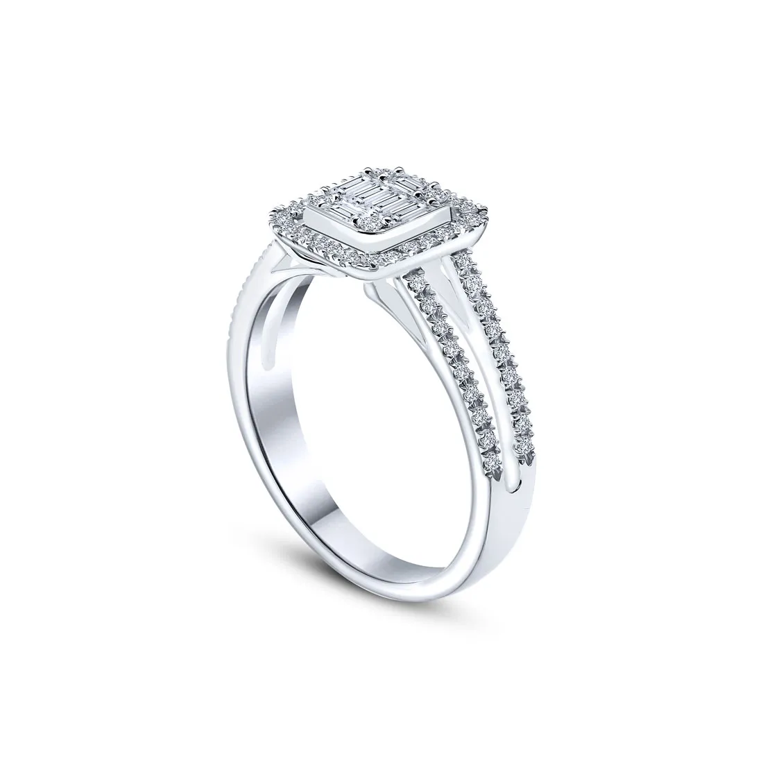 The 0.70 Carat Square Baguette Diamond Ring with Side Stones is a striking piece that combines precision and brilliance. At its heart are four square baguette diamonds, totaling 0.21 carats, with F color and VS to SI clarity. These baguette stones form a bold geometric center, creating a structured yet elegant look.