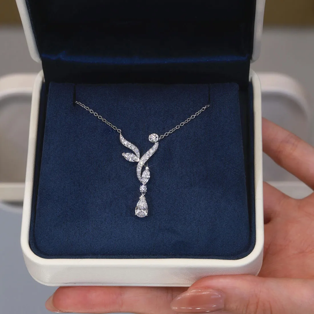 The 0.90 Carat Pear-Cut Designer Diamond Necklace is created to reflect elegance, beauty, and timeless charm. At its center, a stunning 0.50 carat pear-cut diamond captures light with graceful brilliance. Graded F color and SI2 clarity, it offers exceptional sparkle from every angle. Enhancing this focal gem are two marquise-cut diamonds totaling 0.20 carats and fourteen round brilliant diamonds totaling 0.20 carats, all with F color and VS/SI clarity. Together, these diamonds create a radiant composition that highlights the beauty of the main stone while adding depth and sophistication.