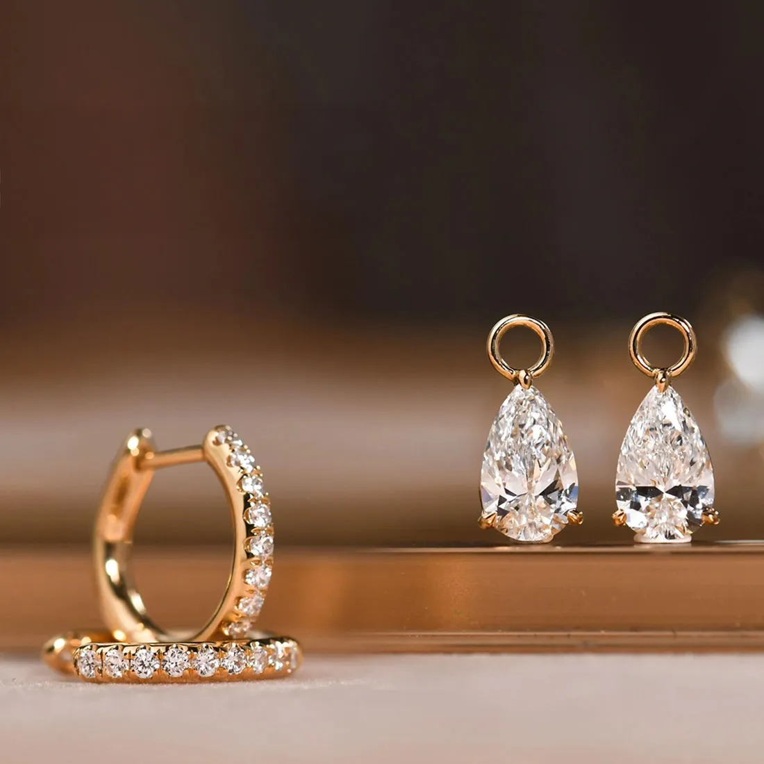 The 1.15 Carat Pear-Cut Diamond Hoop Earrings blend graceful form with exceptional brilliance. Each earring features a stunning 1.00 carat pear-cut diamond, graded F in color and SI2 in clarity. These two center stones create a striking focal point that captures attention instantly. Surrounding them are sixteen round brilliant diamonds, totaling 0.15 carats, selected for their F color and VS/SI clarity. Together, they form a radiant design that elevates every look with luxurious sparkle.