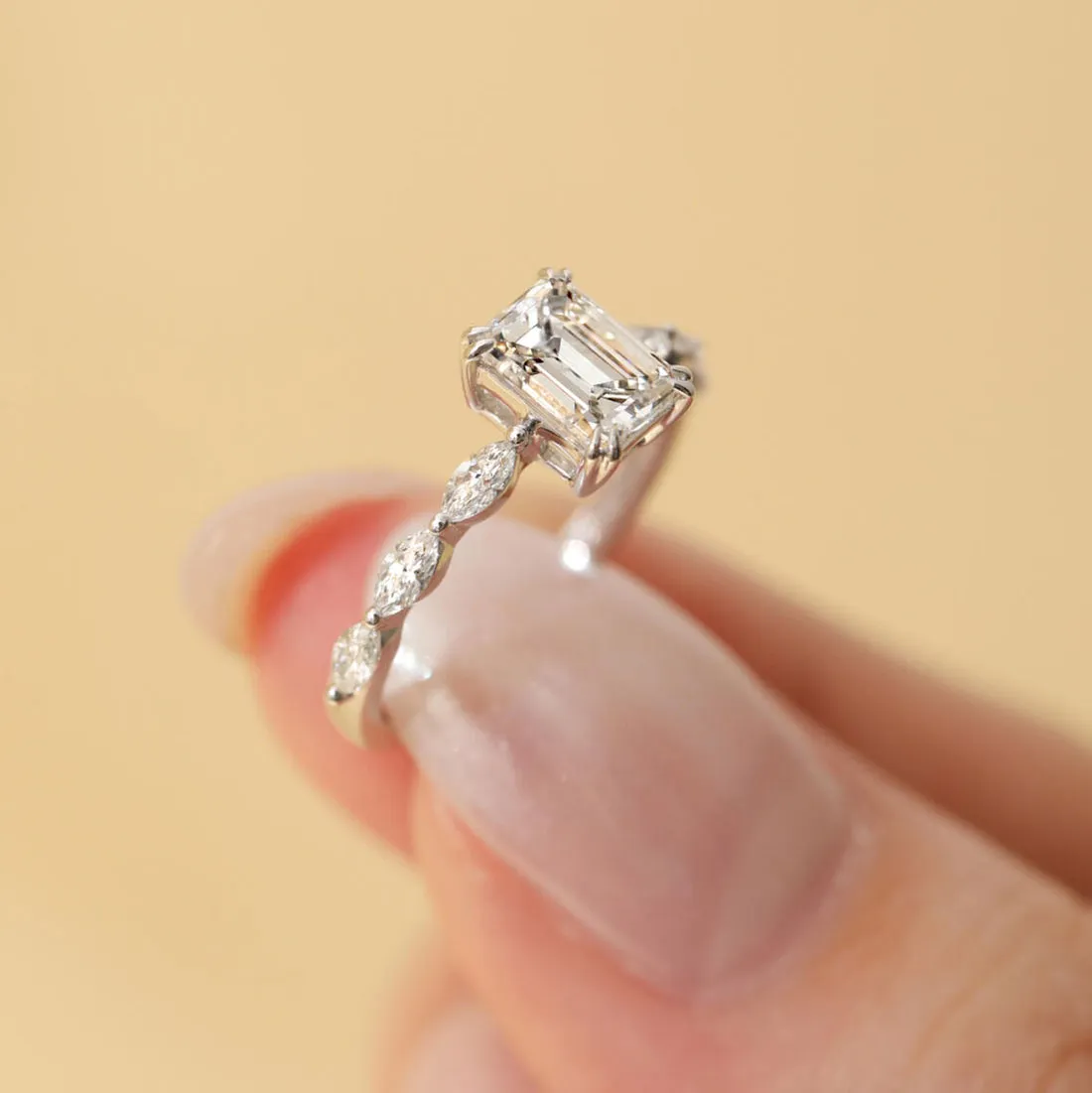 The 1 Carat Emerald-Cut Diamond Solitaire Ring blends timeless elegance with modern refinement. At the heart of this stunning design lies a 0.70 carat emerald-cut diamond, chosen for its clean lines and mirror-like reflections. Framed by six marquise-cut diamonds totaling 0.30 carats, the ring achieves a graceful balance of symmetry and sparkle. This piece is ideal for those who admire architectural beauty in fine jewellery.