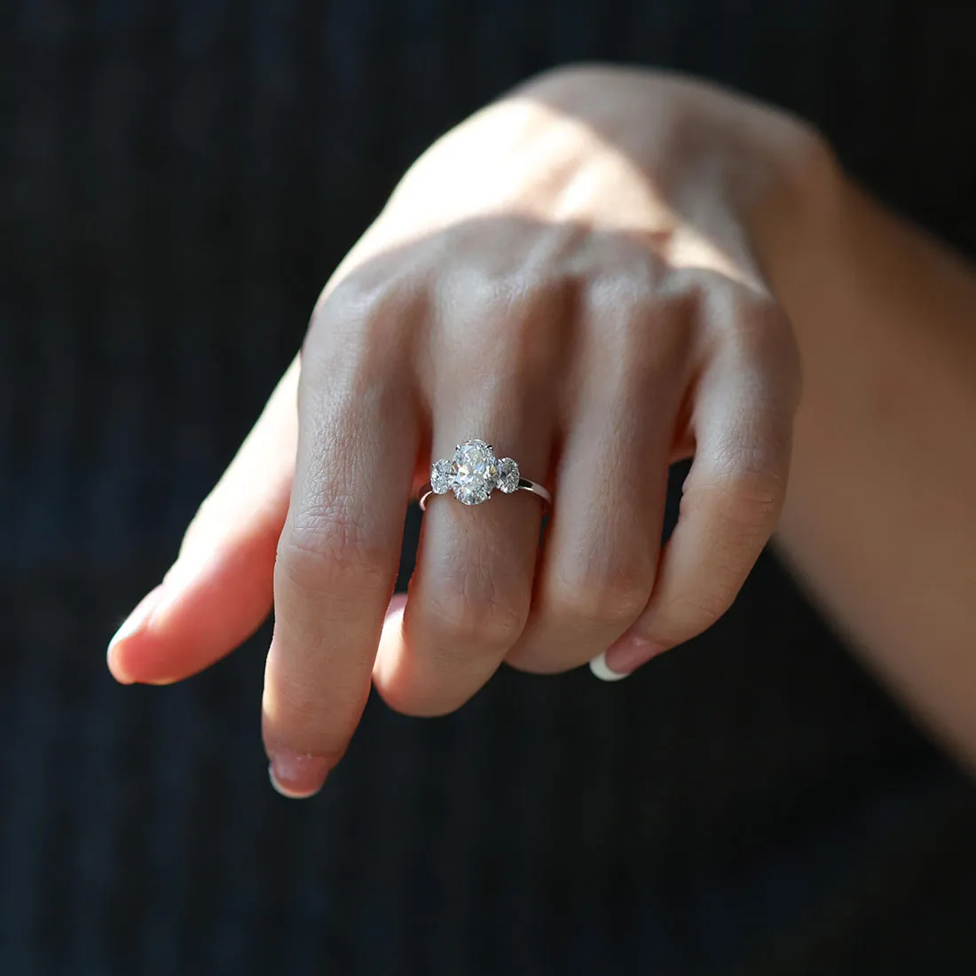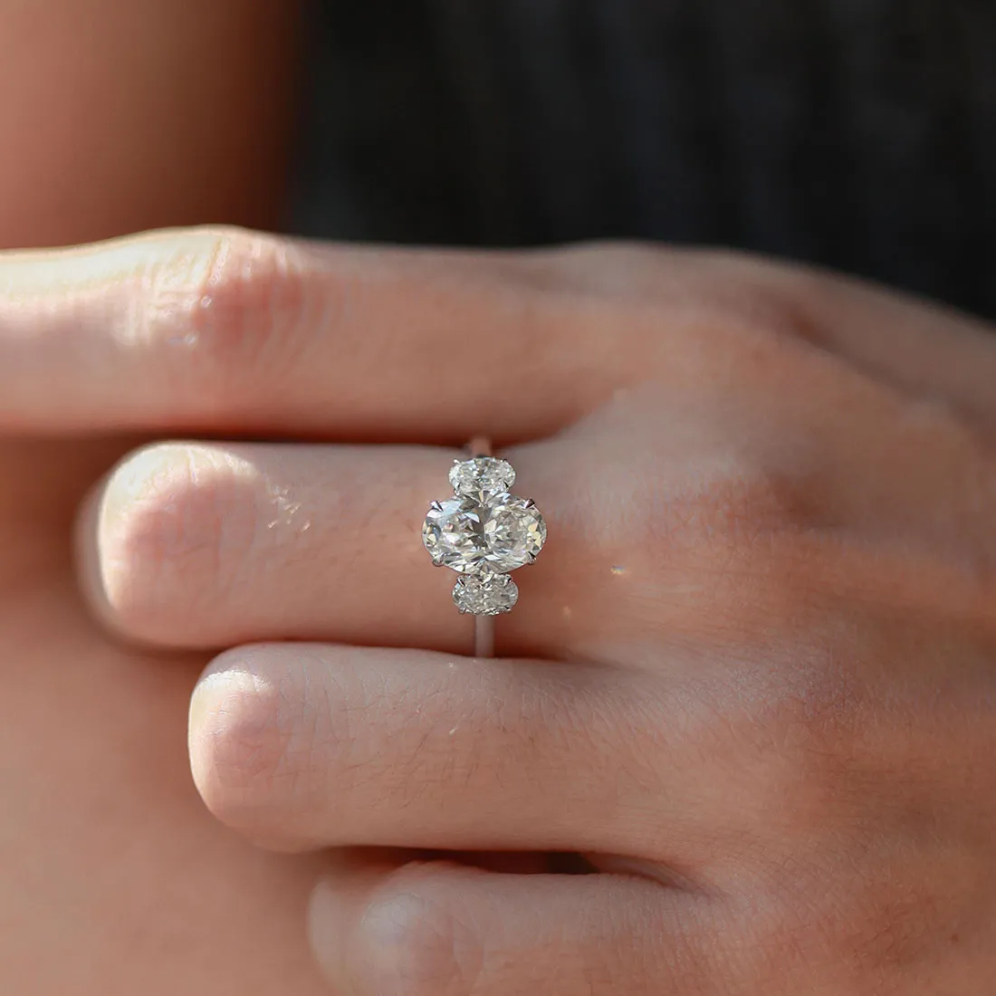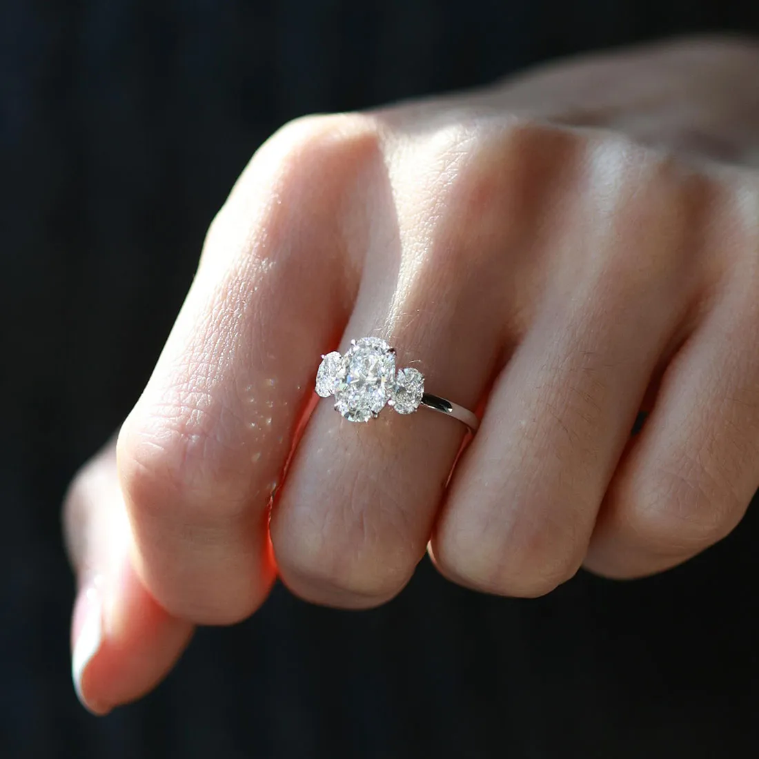 The 2.60 Carat Oval Cut Diamond Tria Solitaire Ring is a masterful blend of elegance, brilliance, and contemporary charm. Designed for those who appreciate classic beauty with a bold twist, this ring showcases a striking oval-cut center diamond flanked by two equally graceful side stones. Its soft curves, elegant proportions, and radiant sparkle make it a powerful statement of timeless love.