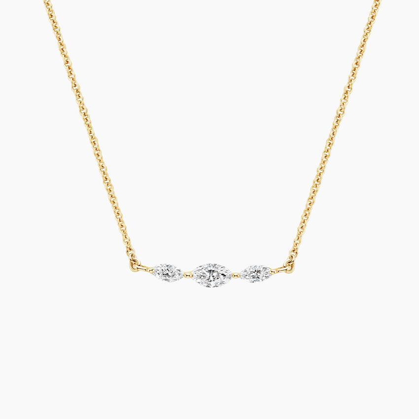 Each diamond in the Margot Diamond Necklace is expertly chosen for its quality and clarity. The design includes one central 0.28 carat E color VS clarity marquise diamond, beautifully framed by two 0.29 carat E color VS clarity marquise diamonds. The total diamond weight brings refined sparkle without overwhelming the eye. Together, they create a harmonious, balanced composition that glows with sophistication.